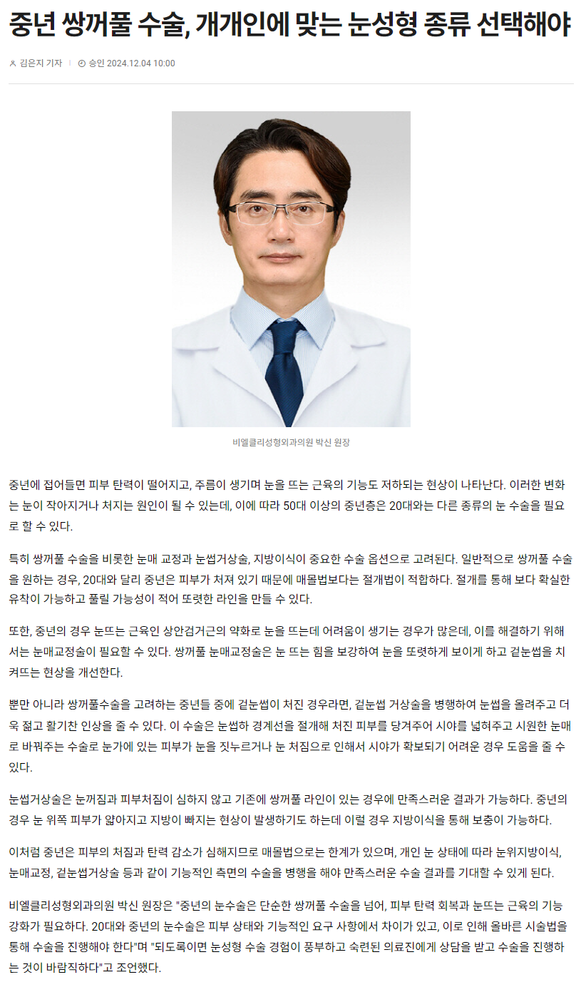 [언론보도] 중년 쌍꺼풀 수술, 개개인에 맞는 눈성형 종류 선택해야