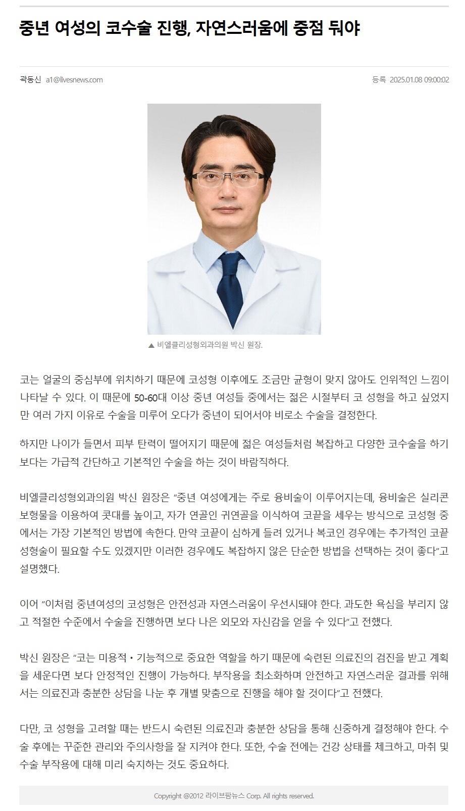 [언론보도] 중년 여성의 코수술 진행, 자연스러움에 중점 둬야