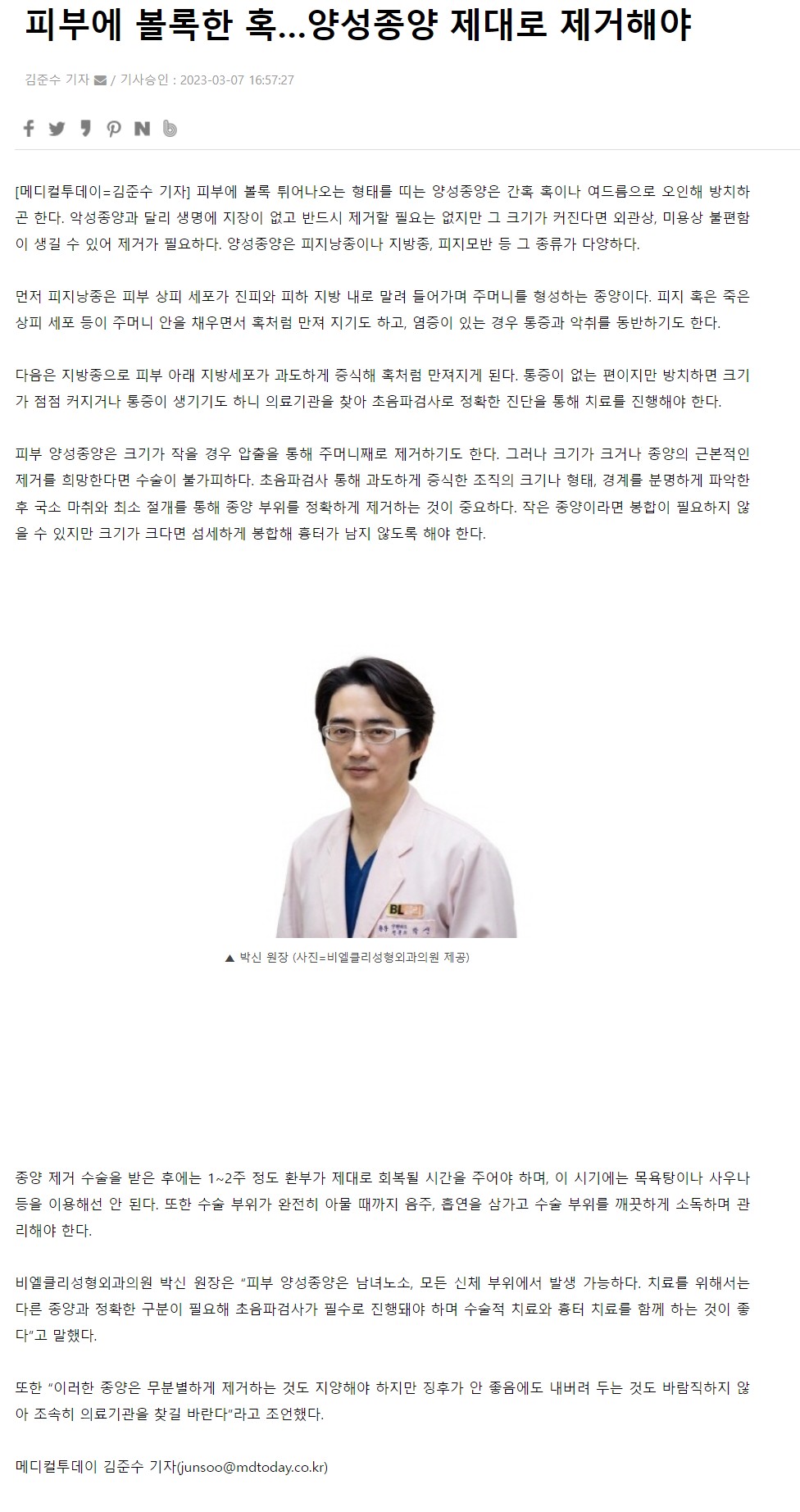 [언론보도] 피부에 볼록한 혹…양성종양 제대로 제거해야