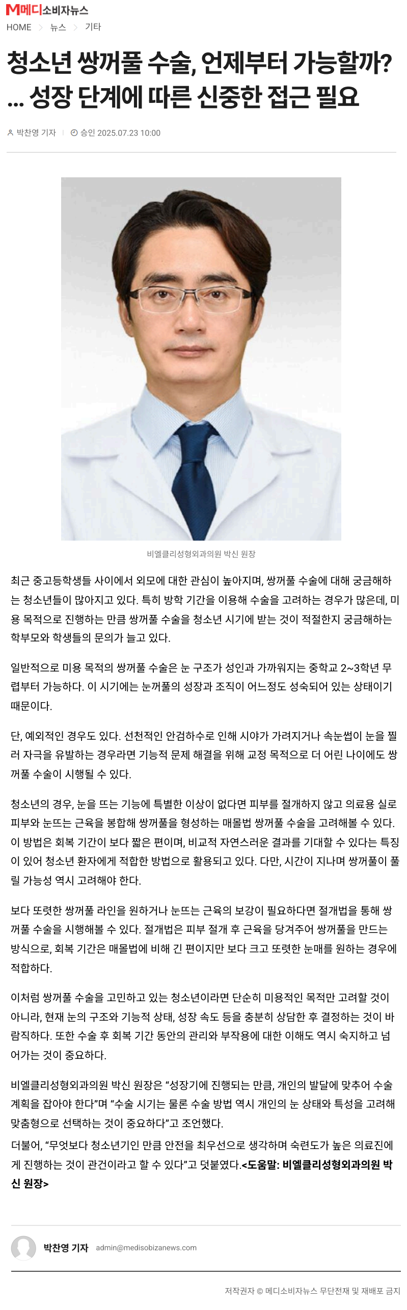 [언론보도] 청소년 쌍꺼풀 수술, 언제부터 가능할까? … 성장 단계에 따른 신중한 접근 필요
